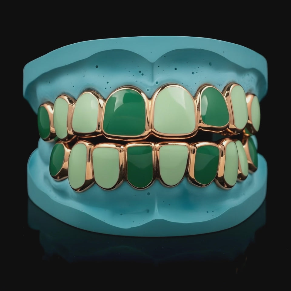 This design combines the cool brilliance of sterling silver with a striking pop of color, thanks to the smooth enamel coating. It's a contemporary take on grillz that allows for bold personalization, creating a truly unique and expressive piece.